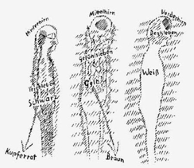De todos modos, algunos esquemas de Steiner para sus conferencias son verdaderamente preocupantes porque afirman como hechos lo que no son sino creencias. Por ejemplo, este otro, de la conferencia de 1923 "El color y las razas de la humanidad", donde a los negros se les atribuye sólo una "vida instintiva" que realizan con la parte posterior del cerebro, a los asiáticos una "vida emocional" que experimentan con el "cerebro intermedio" y, sorpresa, resulta que los blancos tienen una "vida pensante" que disfrutan con el "cerebro delantero".